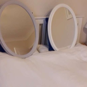 Two painted mirrors. One white the other pale grey. Can be hung either way. 64 cms by 49 cms