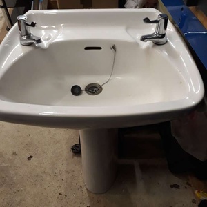 White Pedestal wash basin, complete with lever taps and plug on chain good condition Height 82 cms width 56 cms depth 44 cms all measurements are approximate to within 1 or 2 cms