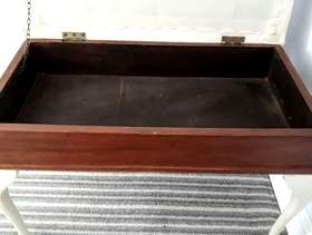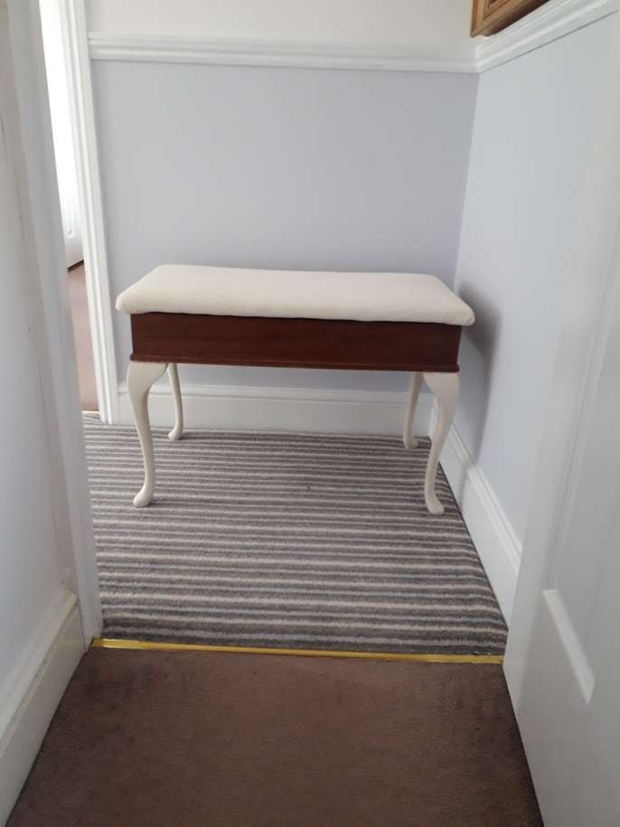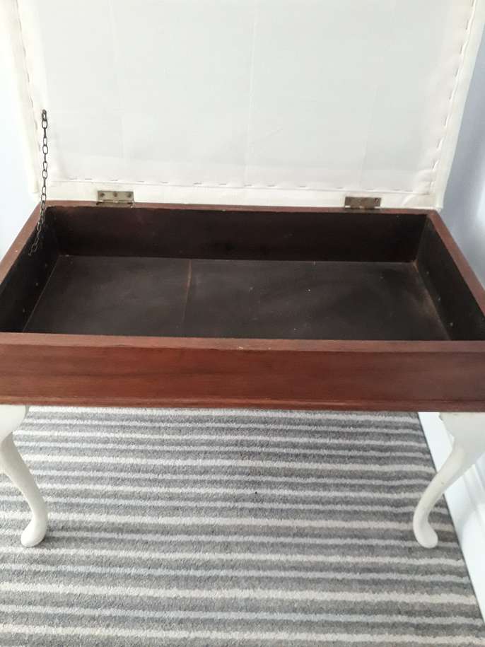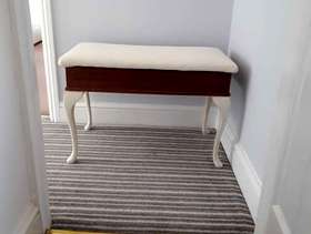 Piano stool covered in cream fabric. Pale cream painted legs. Lid opens for storage. Height 50 cms. Width 77 cms. Depth 43 cms.