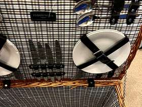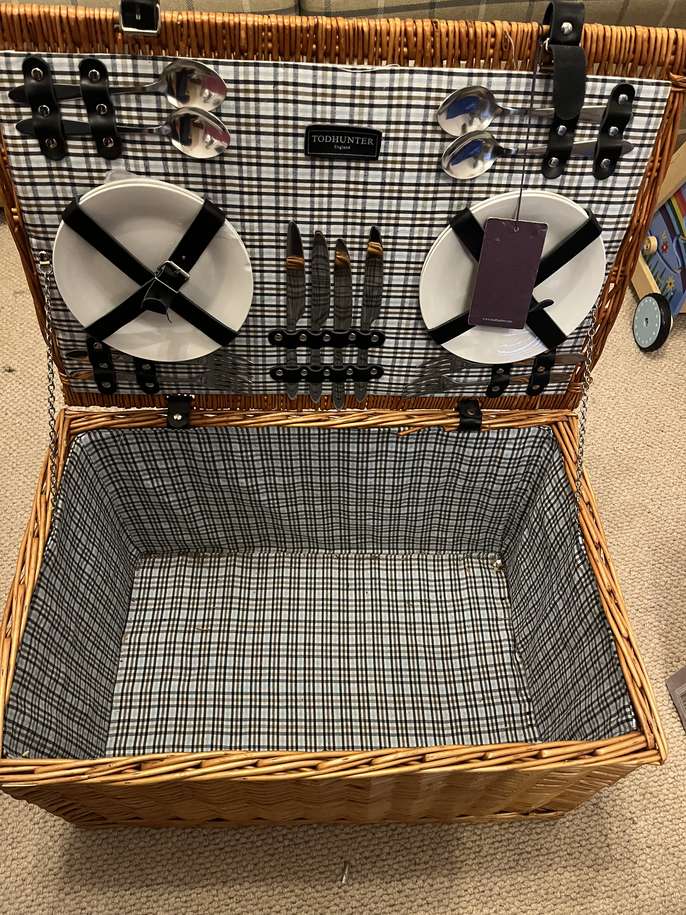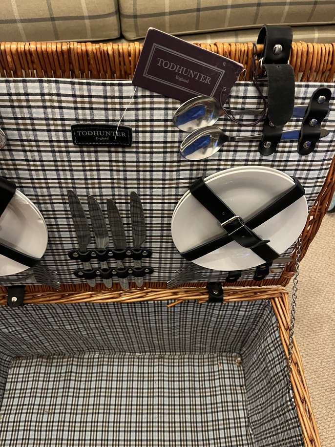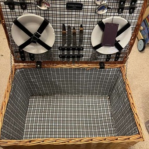 Picnic basket - never been used . Has 4 plates 4 spoons and 4 knives . One of the plates has a little chip on it