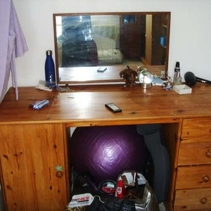 Very nice PINE desk (real wood) can be used as dressing table. is 145 x 60 with drawers one side and cupboard the other. comes apart for transport so easy in a car