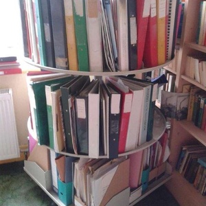 Free standing mobile trolley to store files with two circular storage trays and one square storage tray see photo and https://www.shelvingdirect.co.uk/files-and-folders