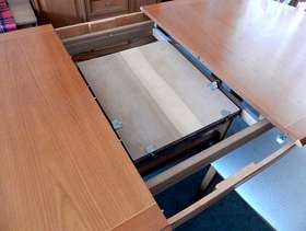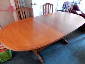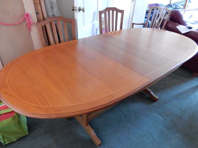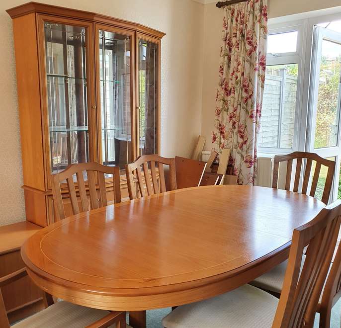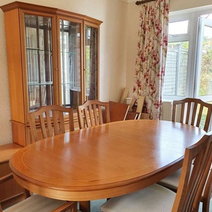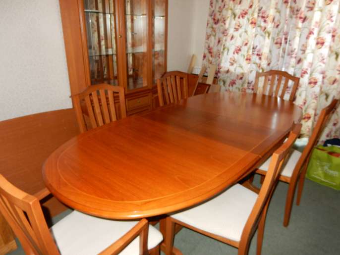 Polished wood, extending dining table and 6 polished wooden framed chairs with cream coloured fabric seat covering. 4 standard chairs and 2 carver chairs. Table extends with fold-away centre section. There are some marks on the fabric seats. Table dimensions: Width 100cm, height 75cm Length: closed 172cm, extended 215cm Matching Display Cabinet also available. £100 ono Delivery in Leamington area is possible. Cubbington / Leamington Spa Please contact 07791 487 999