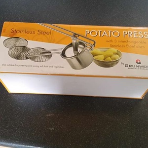 Stainless steel potato ricer, used twice. Very handy bit of kit but I will have no room in my new place.