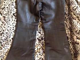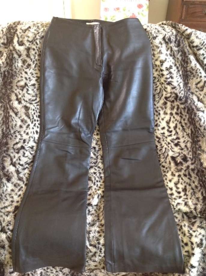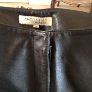 This is a used pair of ladies leather trousers. 100% leather trousers - lining is 100% polyester. They have been worn just a few times. In good condition - no rips or tears! Brand: Autonomy Size: 14 Note that these are not skinny trousers. Zip at front. No pockets. Collect from Guildford GU1.