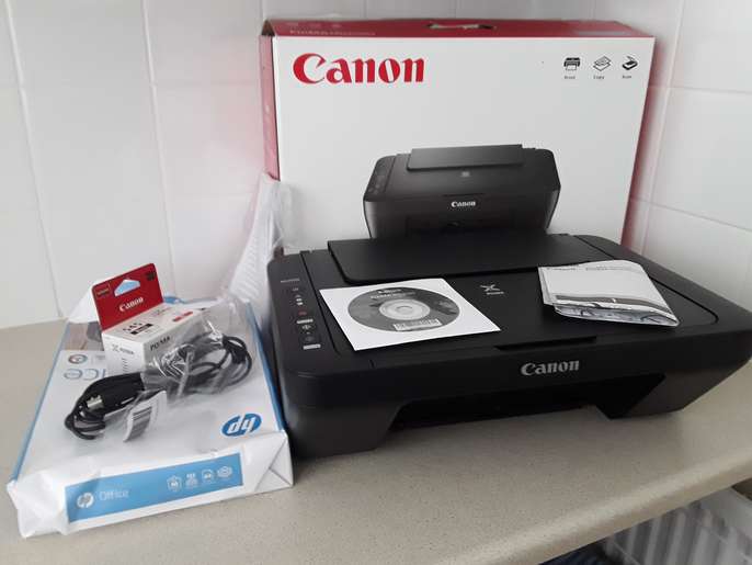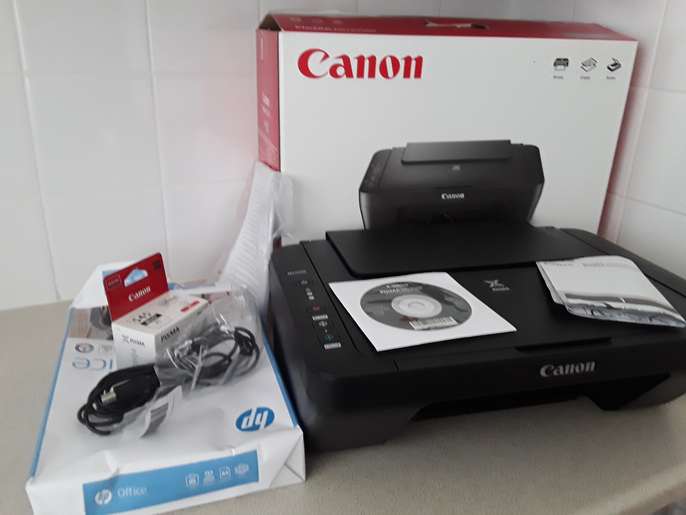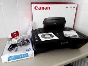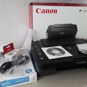 CanonPrinter PixmaMG2500 with brand new black cartridge, nearly a full ream of paper, instruction CD, booklet.