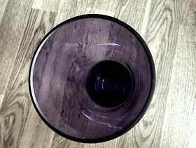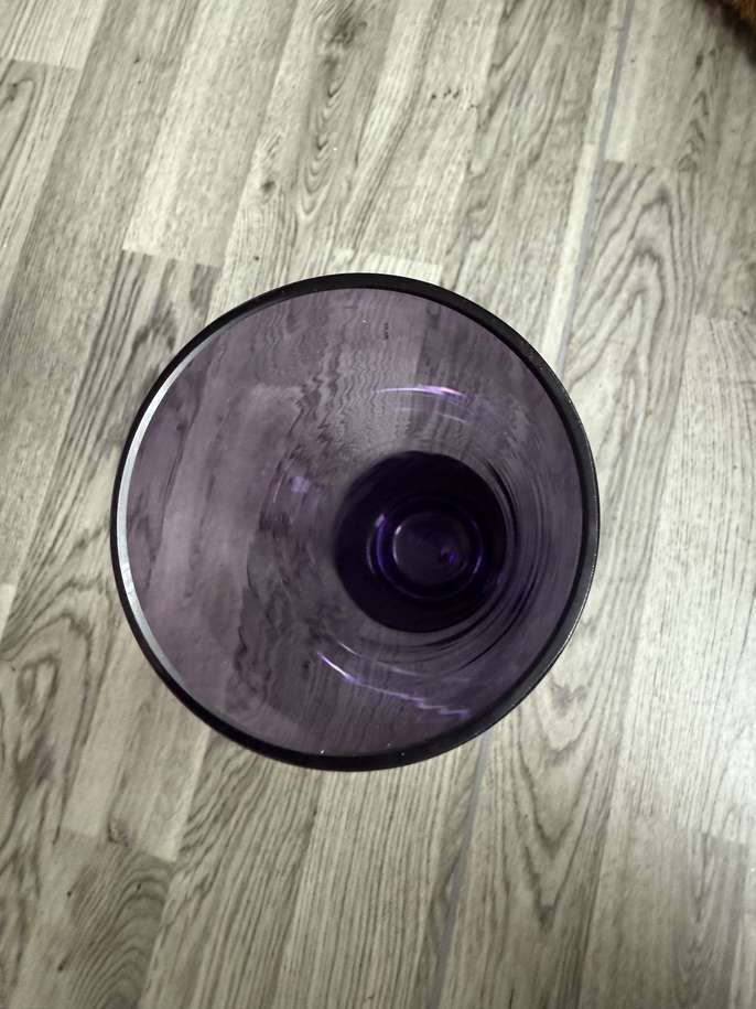 Cylinder shaped purple controlled bubble vase very good condition slight wear on the base and one small shallow scratch at the bottom roughly 2” above where the purple glass starts, I’m not able to get decent photograph because of reflections 40cm tall 8cm wide heavy , not a sharp rim at top it’s smooth has been beveled