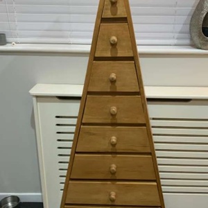 A lovely pine 9 drawer ascending in size pyramid unit. In very good condition, just no longer fits.