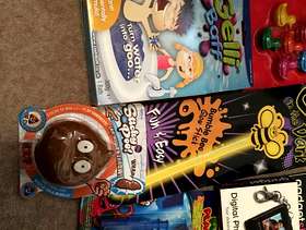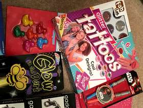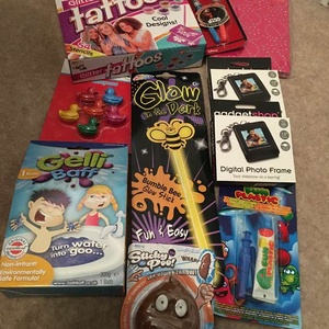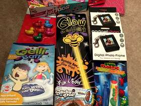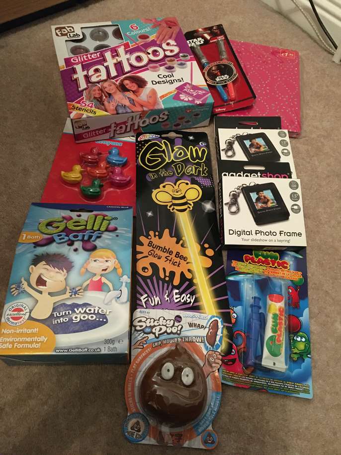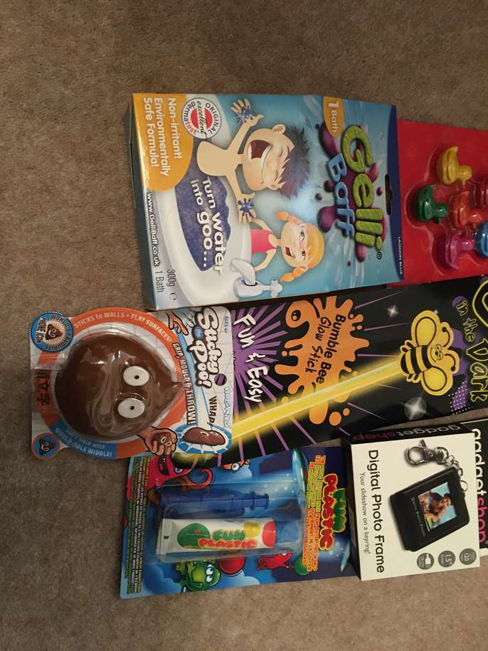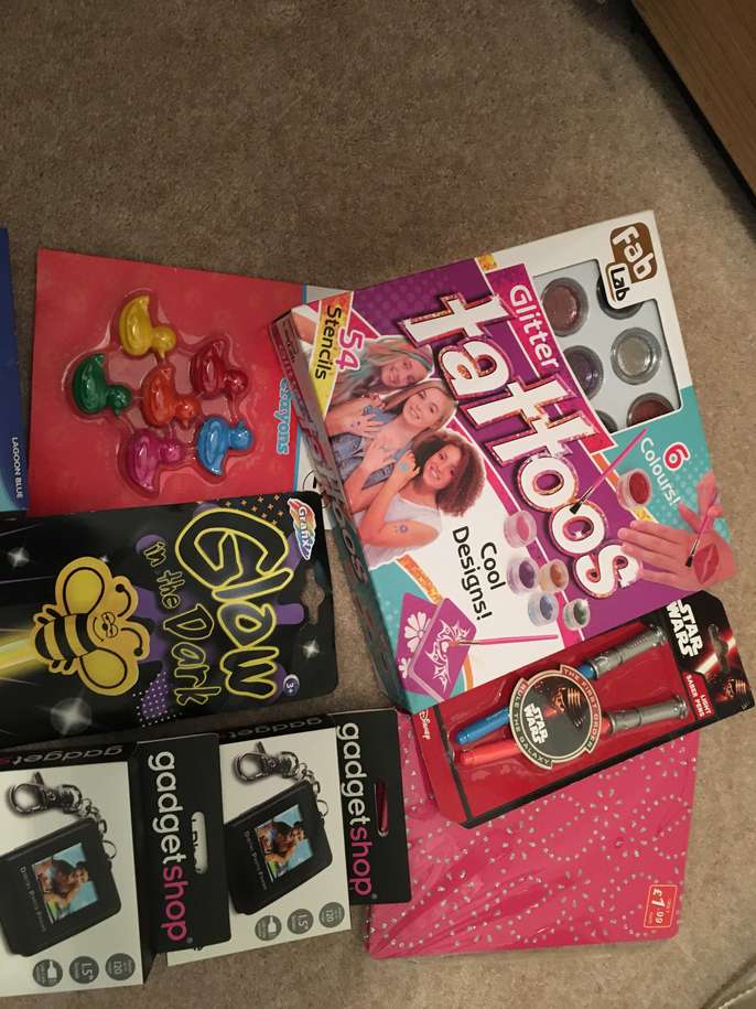 Bundle of Toys - All New Fab Lab Glitter Tattoos Lagoon Blue Gelli Baff - 1 Bath Artwork - 6 Crayons Gadget Shop - 2 x Digital Photo Frames - Slide show on a keyring Star Wars - Light Saber Pens Hog Wild - The Sticky Poo Glow in the Dark - Bumble Bee Glow Stick Fun Plastics - The Magic Balloon Pink/Glitter Notebook On other sites