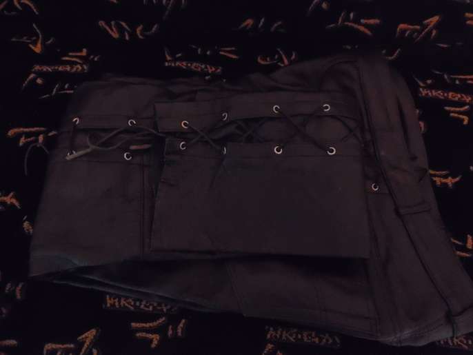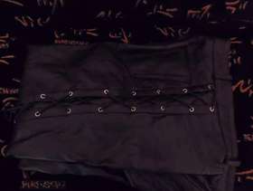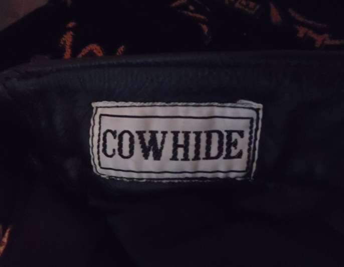 Real Cowhide Leather Black Lace Up Biker Trousers *Has one waist band loop missing, otherwise in good condition (see pics for closer look)* 32" leg & 32" waist Trousers are 100% Black leather cowhide. Pockets have suede feel interiors with suede lace ups. Lining is 100% polyester.