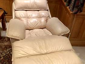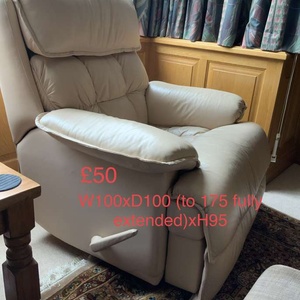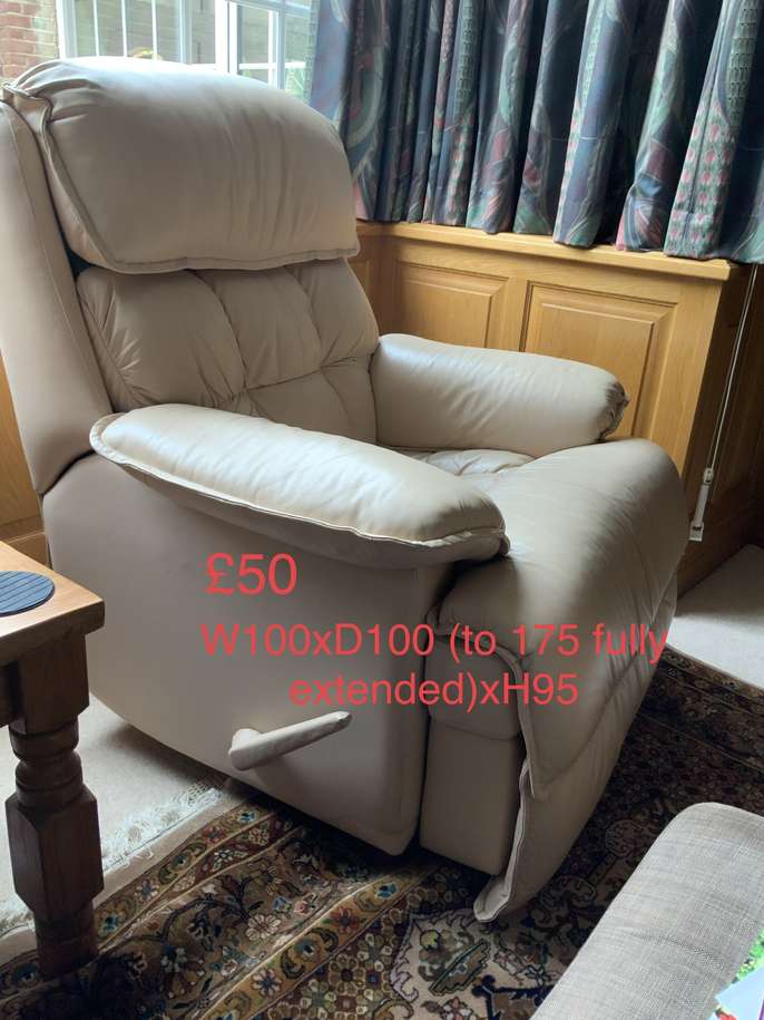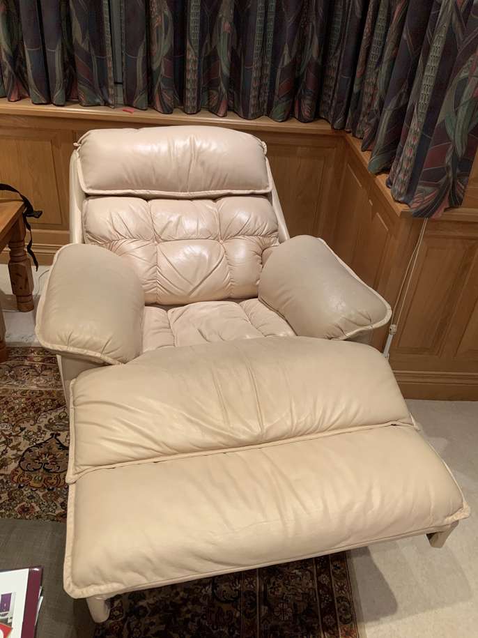 Reclining leather chair pale rose colour. No rips or tears in good use condition. W100xD100 to 175 when fully extended xH95 From a smoke and pet free home. Collection from Banstead SM7