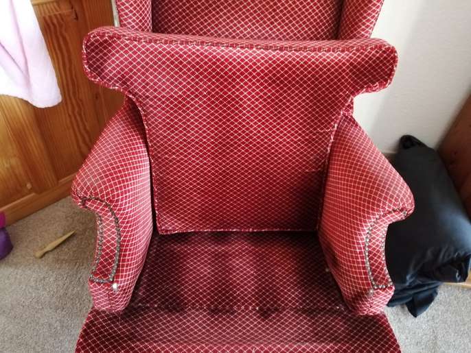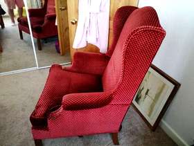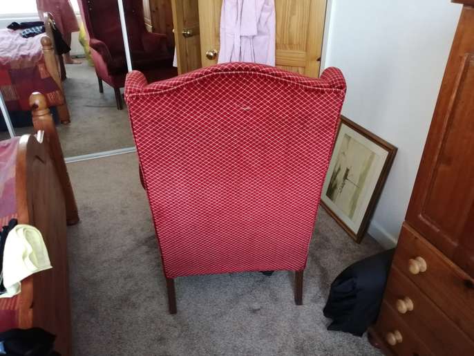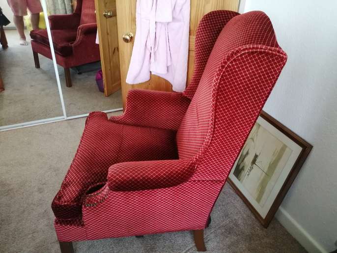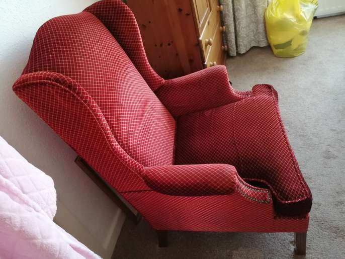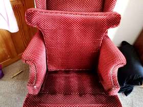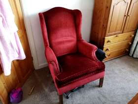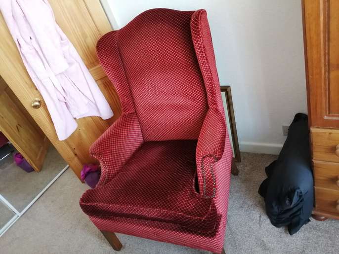 Red velvet ? Arm chair [WING] in great clean condition from smoke free home . it has raised legs to ease sitting down and getting out of the chair and it has sturdy arms, it has a subtle criss cross pattern, detachable cushion , very comfortable chair with lots of unused snoozes left in it ,Collection North Baddesley Ad ID: 1376619358