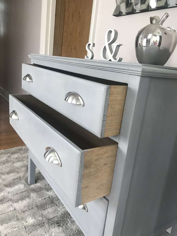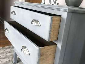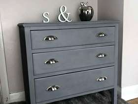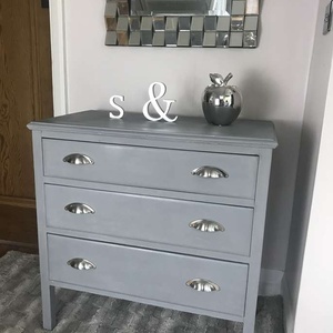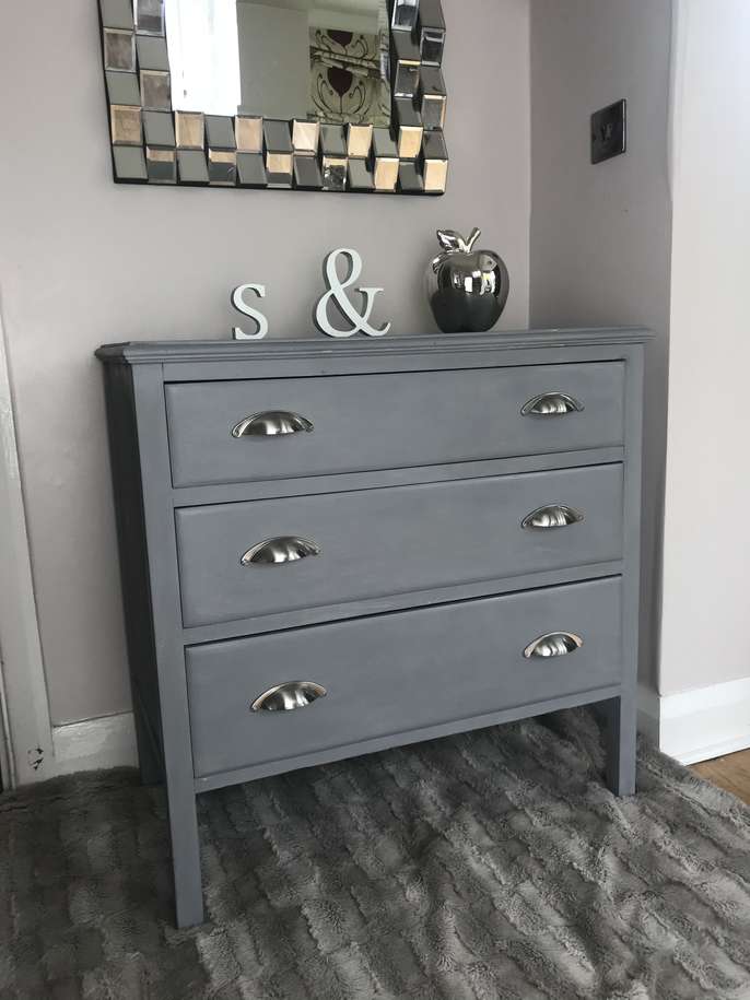 Shabby chic chalk painted in anthracite grey and waxed. Brushed chrome cup handles. 77cm high, 76cm wide, 43cm deep.
