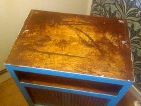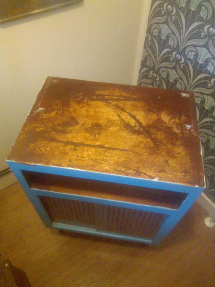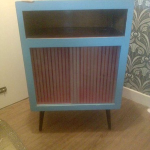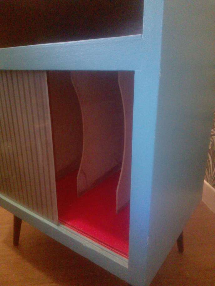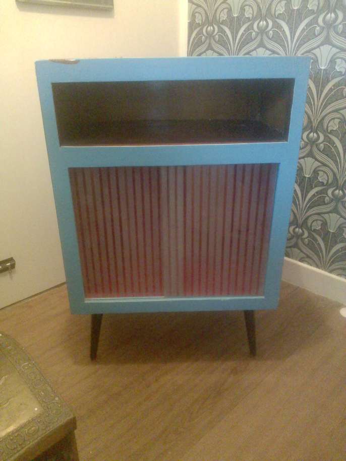 Unique, very sturdy piece. Top has been stripped but just needs sanding and refinishing. Ideal for upcycle/restoration. Two frosted glass doors to cabinet and original ply separators for vinyl storage within. Measurements: H: 74.5 cm W: 50.5 cm D: 35.5cm Cash on collection only - Heathrow