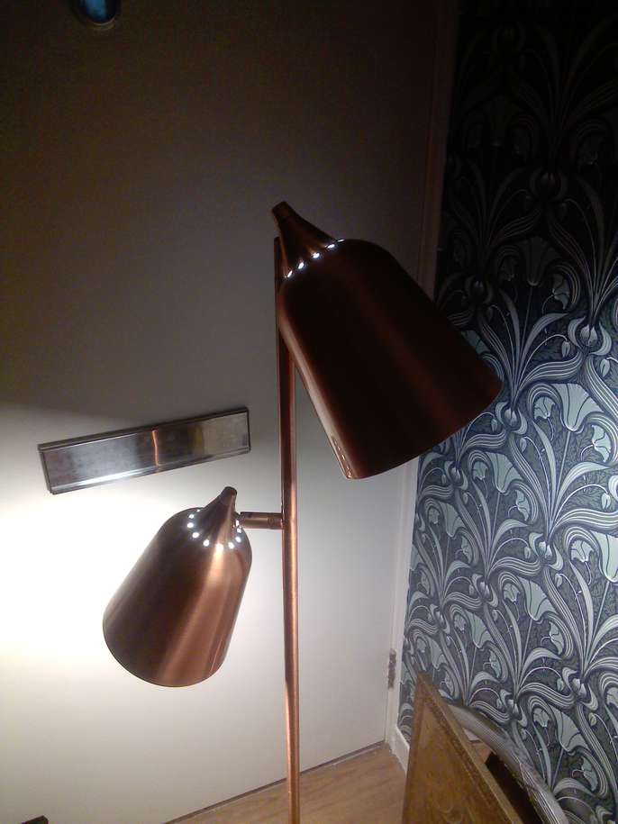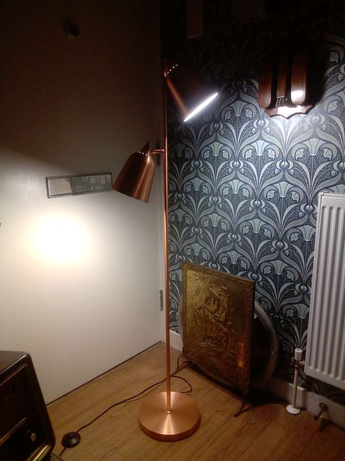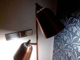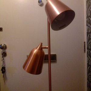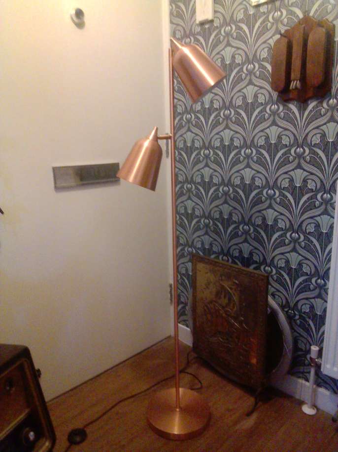 Retro double spot floor lamp with metallic copper finish and floor switch. Lamp comes with X2 working blubs, ready for use. Lamp Dimensions: H - 134cm W - 40cm Base D - 25cm Please study images as these form part of description. Priority to those who make contact with a number, date and time for collection. ***Will also consider trade/swap for any Edwardian to 1940s items you may want rid of - please message with photo and details in first instance*** CASH ON COLLECTION ONLY