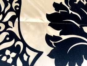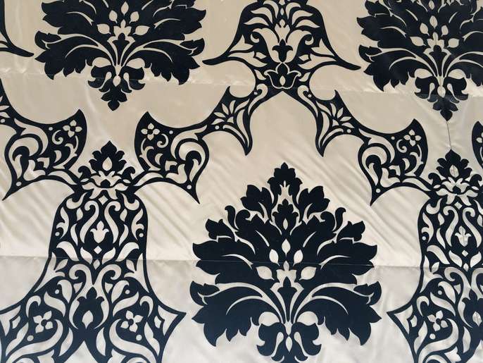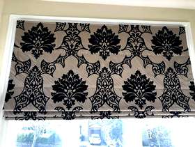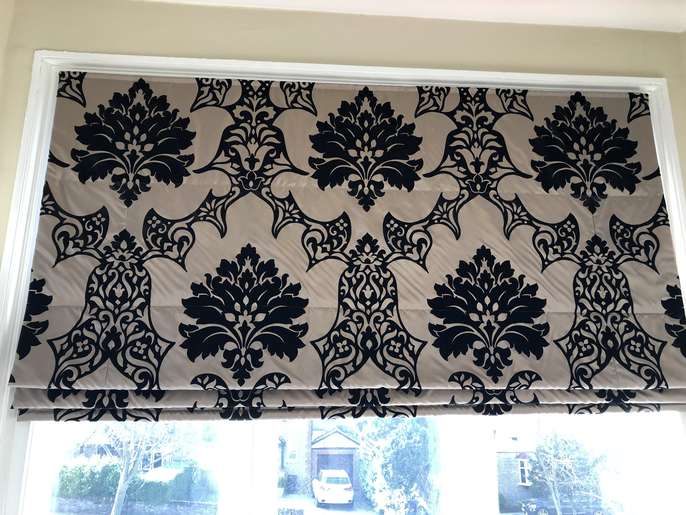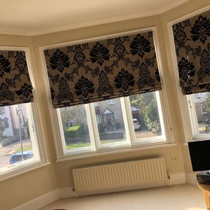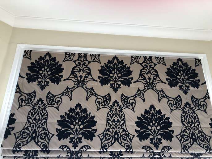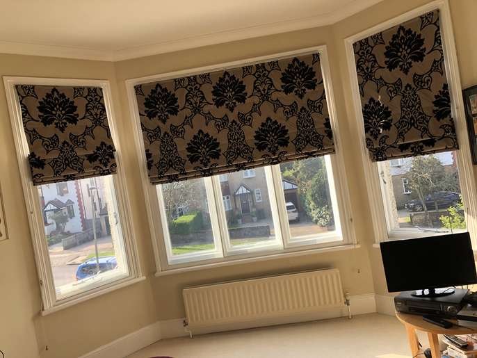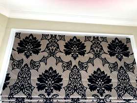 Grey and black satin / damask- all bits included Central blind 187cm long x 186cm wide The 2 side blinds 187cm long x 77cm wide
