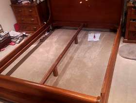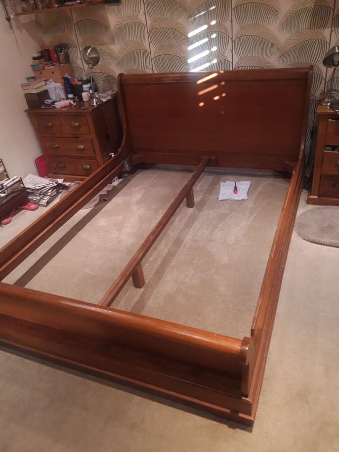 Wooden framed king size bed. In very good condition. Full instructions available on how to assemble. All pieces included and in good working order. The slats are not in the pictures but they are included.