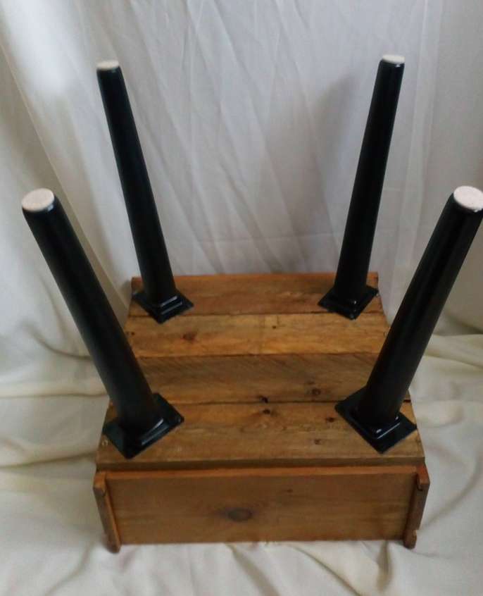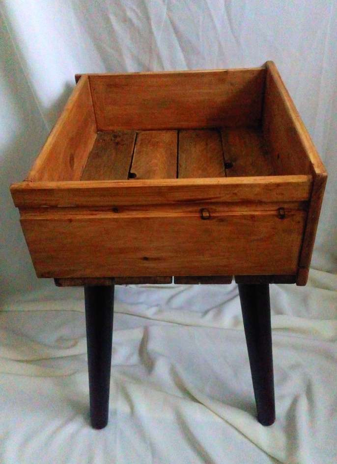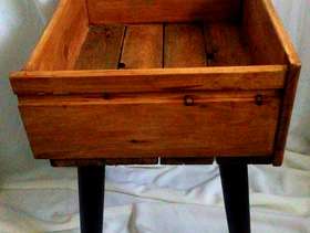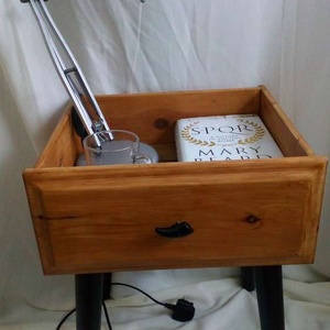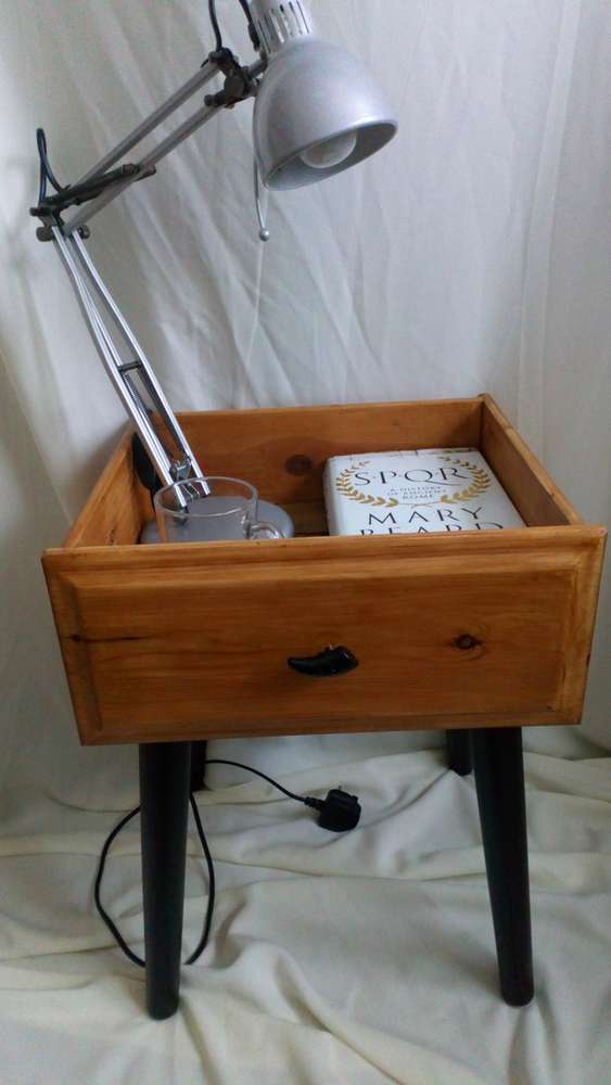 Rustic/Industrial unique side/Coffee table made from an Upcycled pine drawer and reclaimed wood. Features tapered pine legs painted black with felt on the bottom to prevent scuffing. Great as a side table or bedside table as nothing falls off. Solid piece of furniture. Dimensions H 19.5" W 14.5" D 13.5" Collection required.