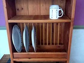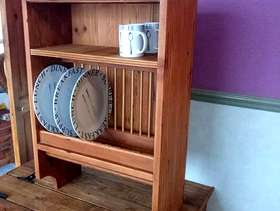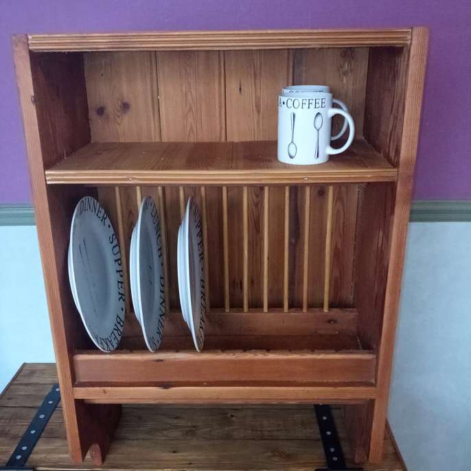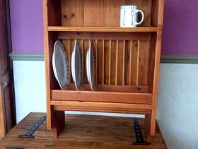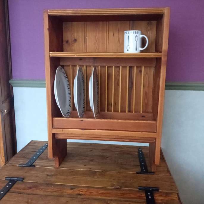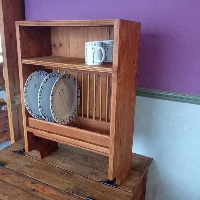 Rustic farmhouse pine plate rack with shelf finished in oil. H: 81 cm W: 54.5 cm D: 26 cm Shelf depth: 23 cm If you like this item please feel free to get in touch with us, we'll be more than happy to assist with any queries you may have. Also check out our other items on our website: https://leymansworkshop.wordpress.com