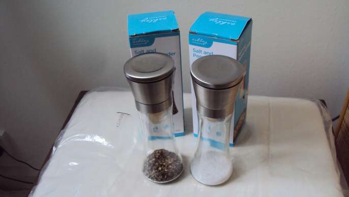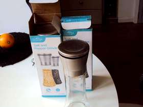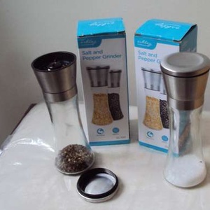 Stainless steel and glass, with lids on the top, so you remove the lid and grind from the top, then you don’t get salt or pepper constantly coming out from the bottom onto your table. Got as far as filling them but not used! Capacity 180 ml, height 19cms x base diameter 5.5cms. They are stylish and durable and easy to unscrew to fill and being transparent glass, you can see when they need filling. Selling the two together for £10 cash (they retail now at just over £10 each). Collect in London NW11 halfway between Golders Green and Finchley Central tube stations, buses a 3 min walk on Finchley Road or 5 mins on North Circular (nearest bus stop post code is NW11 6AG). Free to park outside.