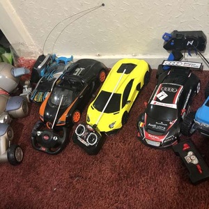 Selection of toys including remote control cars & a remote control dog that does tricks.