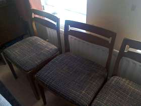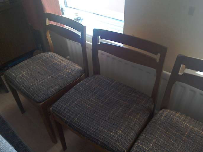 Set of 4 Dining chairs. Used in good condition. Comfortable seat in brown and orange quality fabric. Wooden back and legs.