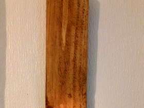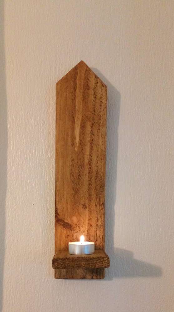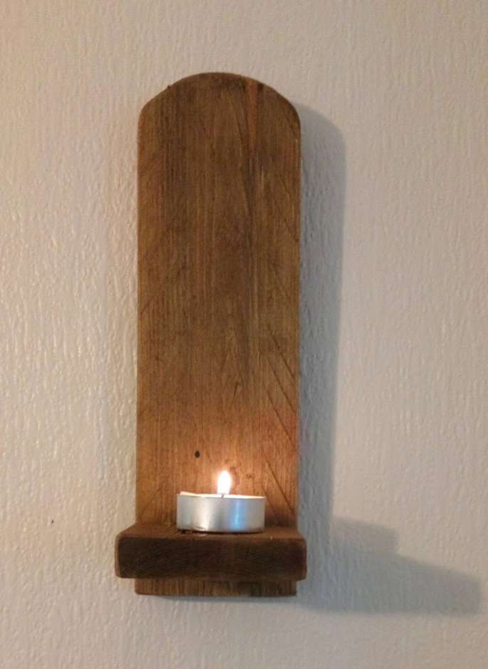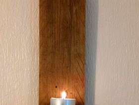 4 wall sconces made from reclaimed wood stained Natural Oak with D rings on the back for hanging. Perfect for a wall feature with ornaments or tealights. Pointed - L 13.5", W 3" Curved- L 9.5", W 3" Collection required.