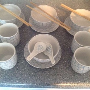 Set of Oriental type China 4 Cups 4 Bowls 4 Saucers 2 Spoons 3 Sets Chopsticks All in new condition Will sell for just £4