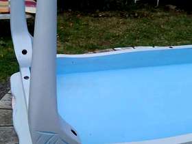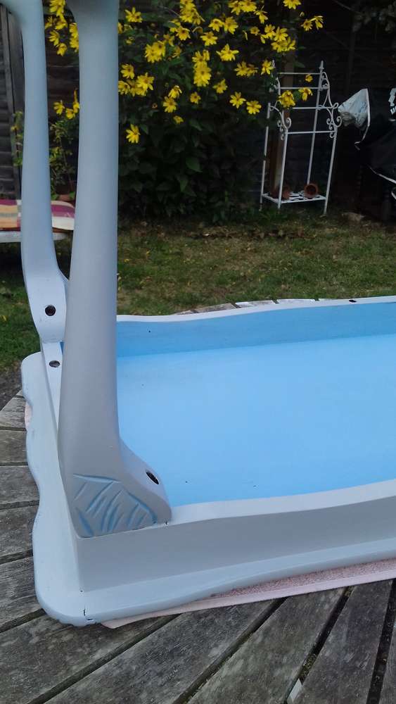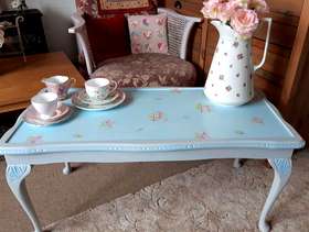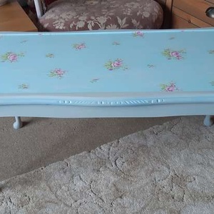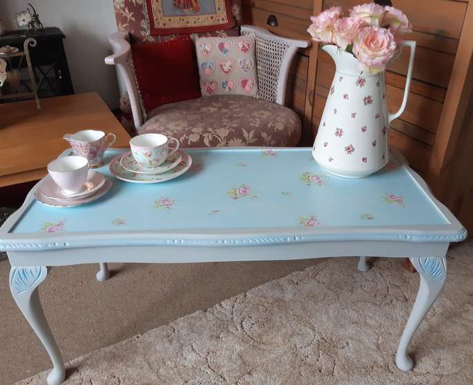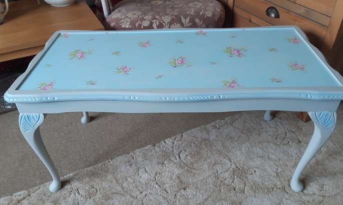 38" L, 18 1/2" D, 18" H Sanded, primed, and undercoat applied. Top coats of paint are a lovely Silver/Grey, with a contrasting Blue for the edges of the table, and underneath. The paper for the top of the table, matches the Blue paint , with pretty Pink roses. The top has been glazed,and a wax applied for added protection. Collection Bierton Viewings always welcome