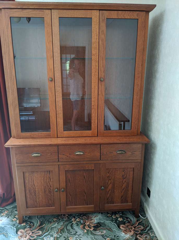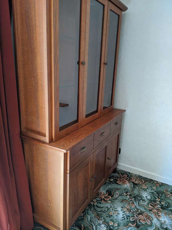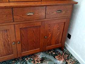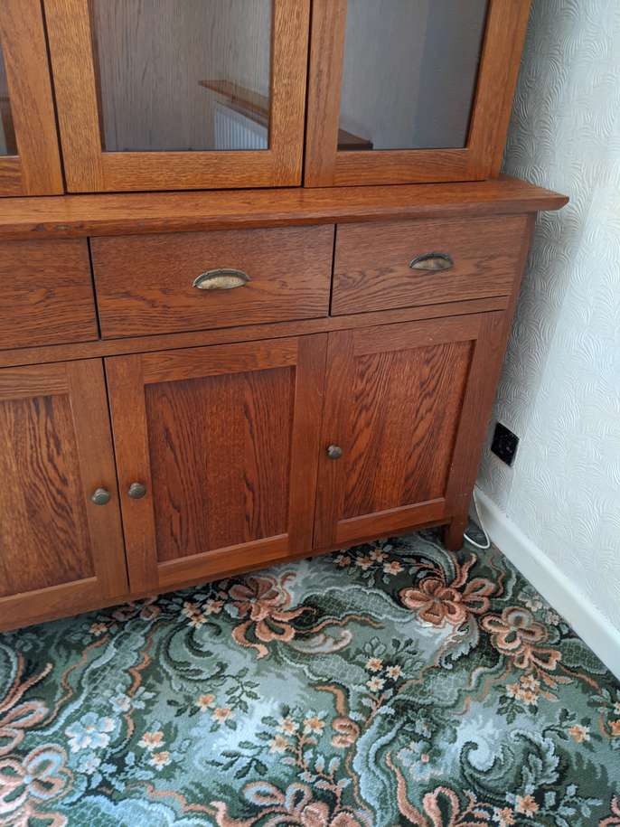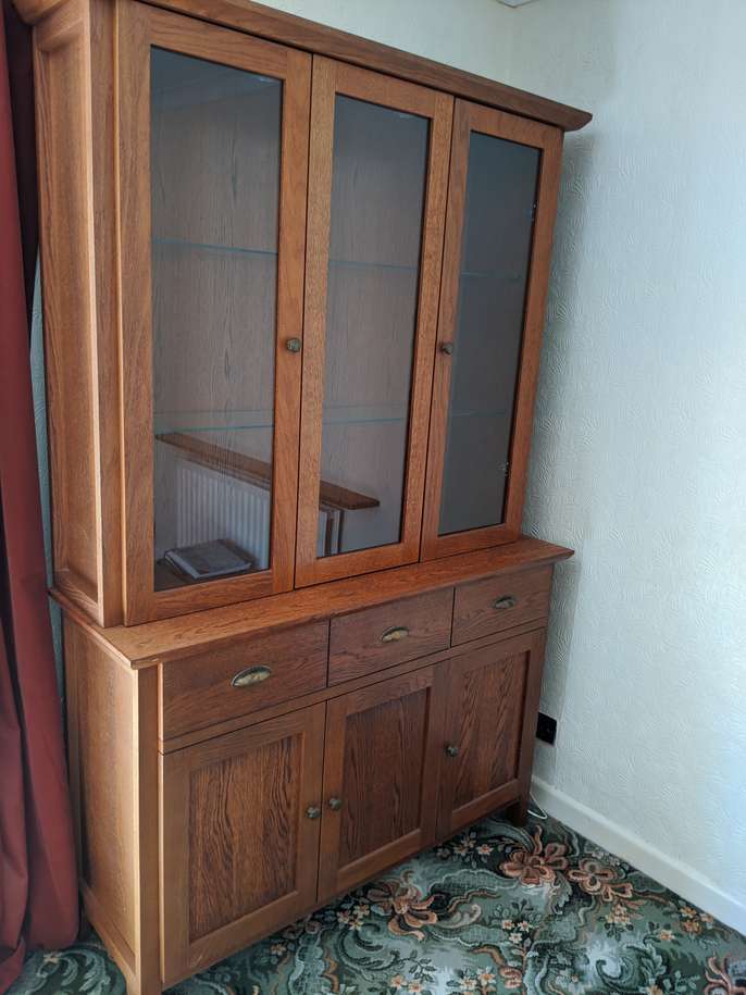 Excellent quality sideboard/display cabinet. . 3 cupboards 3 drawers and glass doors above.. collection Alton hants.. medium colour wood