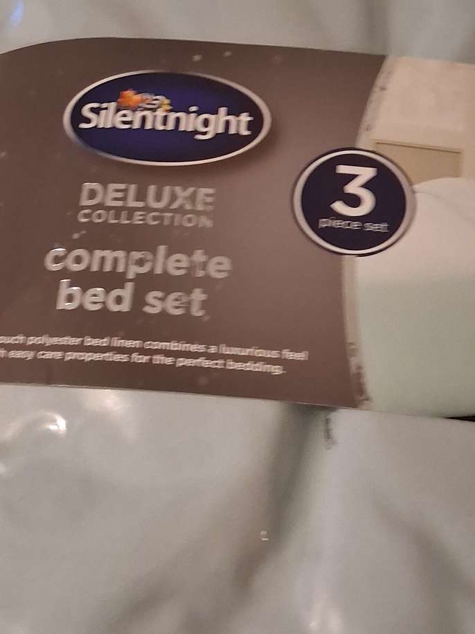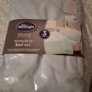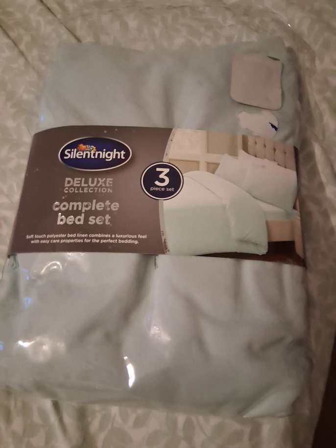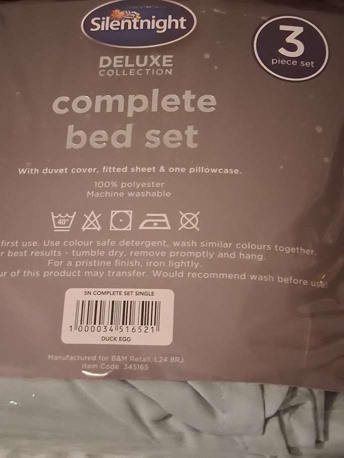 SILENTNIGHT DELUXE COLLECTION 3 PIECE BED SET SINGLE SOFT TOUCH POLYESTER DUVET, FITTED SHEET AND 1 PILLOWCASE LABEL SAYS DUCK EGG (I think more pale green) This has only been used once for visitor Comes in original packaging from pet/smoke free home. Collection or £3.45 postage