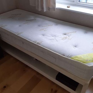 Small single bed, very good condition - with clean mattress. Underbed pull out storage/trundle space (see pic) Size approx 76" long and 30" wide. £65 buyer collects.