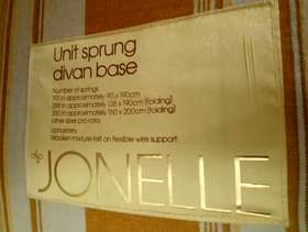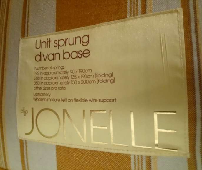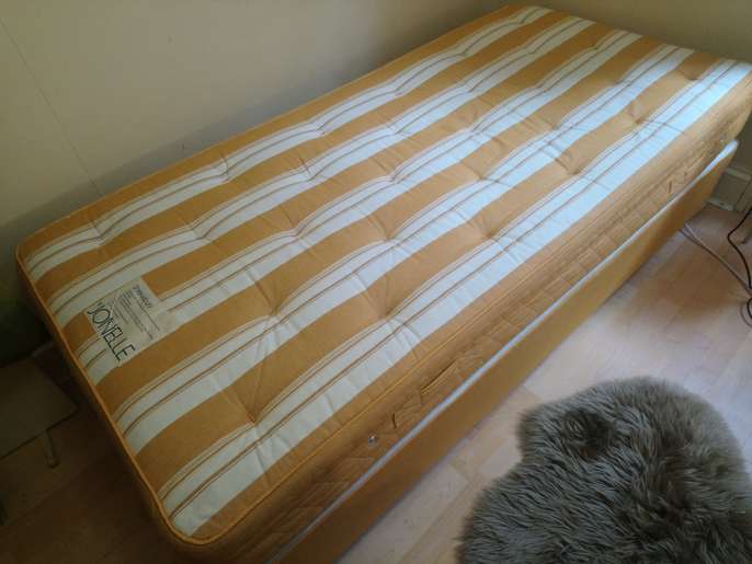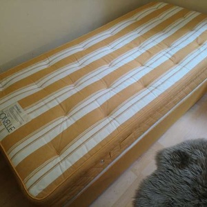 This is a single Jonelle bed with mattress. Unit sprung divan base with Shrewsbury sprung matress. Great condition. Both bed and matress are yellow. Needs to be picked up on 15th or 16th November please. Needs to be taken down one small flight of stairs (I can help!)