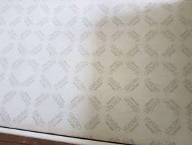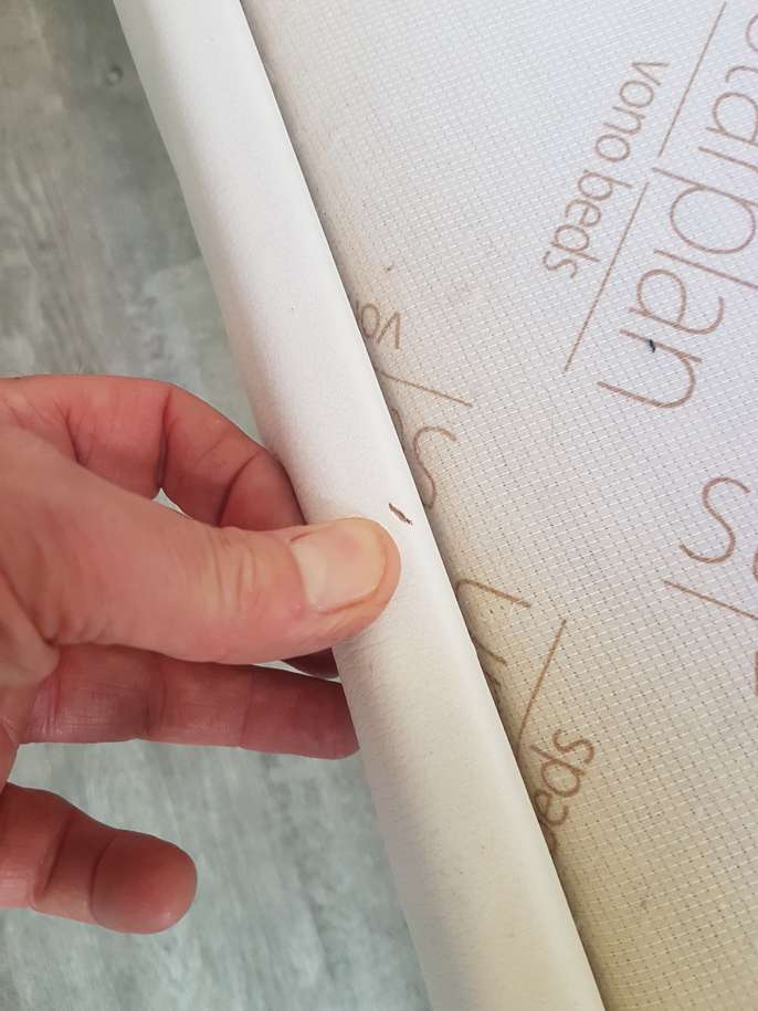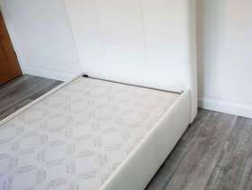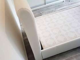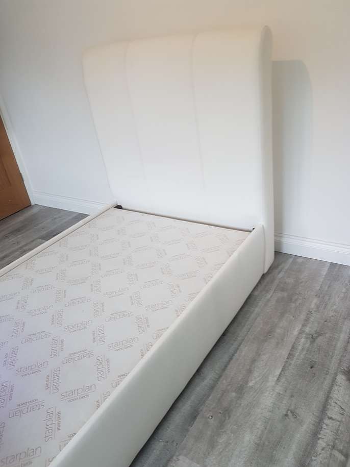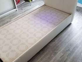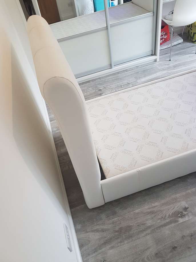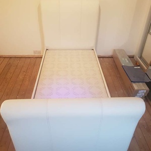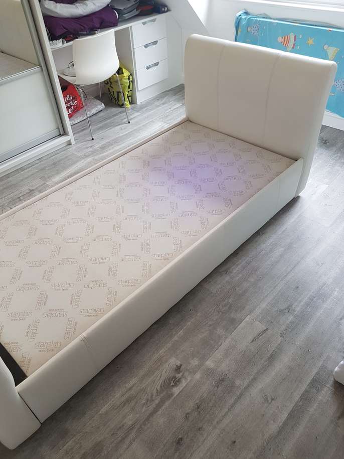 White single bed made from wipable material. Requires large single mattress Length of bed 222cm Width 97cm Height (headboard) 120cm Height (footboard) 89cm There are a couple of tiny rips along the side which are not noticable when fitted with quilt. Clean and good condition the bed pieces (4) hook together with built on brackets, no screws to fit and bed is solid.