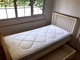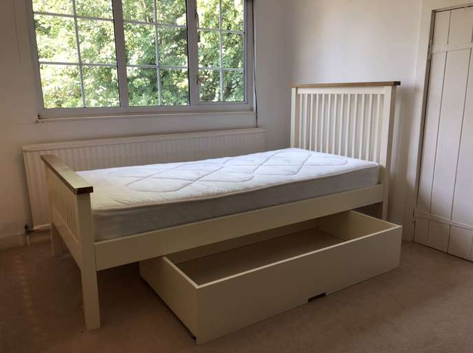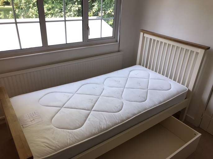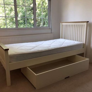 Single bed (3ft). Traditional style cream and oak wooden frame with wooden slats for base. Includes mattress (open coil spring) and matching cream under-bed box. Bed frame can be disassembled for transport. Easy to reassemble.
