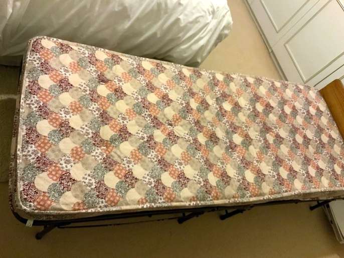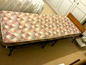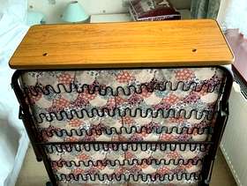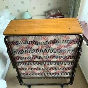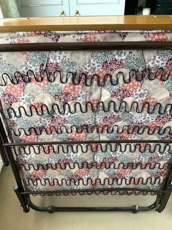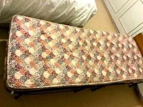 Single fold up bed with attached headboard. On castors to store away. In good condition, clean mattress.
