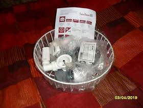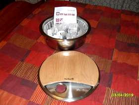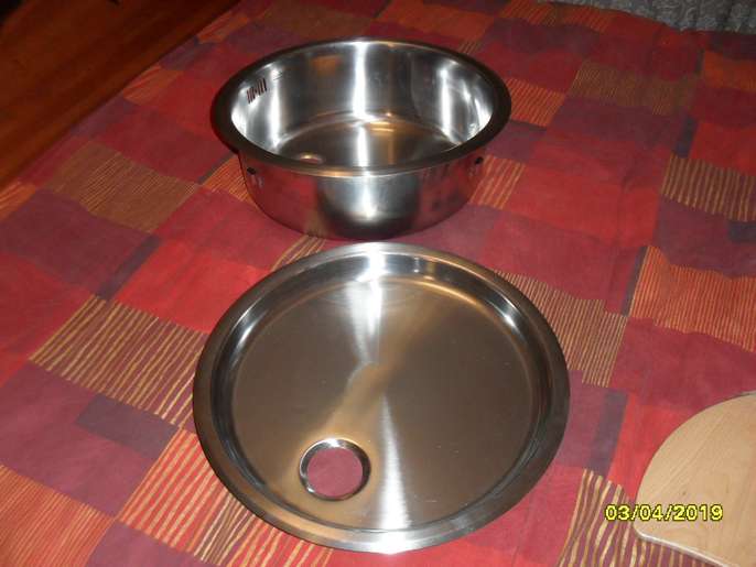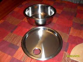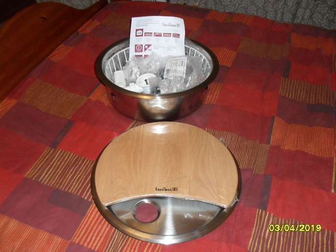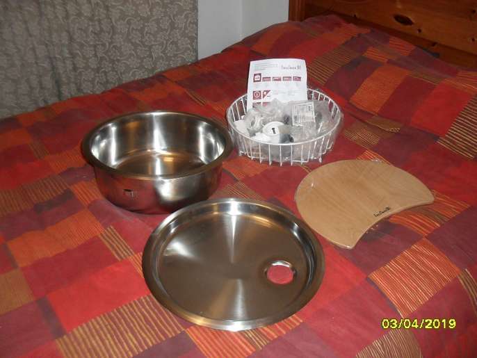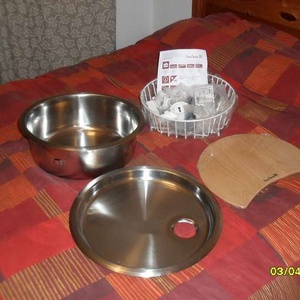 Round bowl and drainer set in stainless steel has wooden cutting board and wire basket and all required fittings brand new, bought in error cost £199 when bought