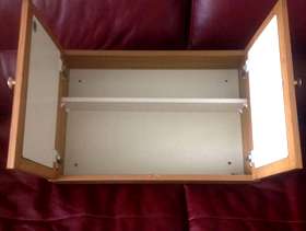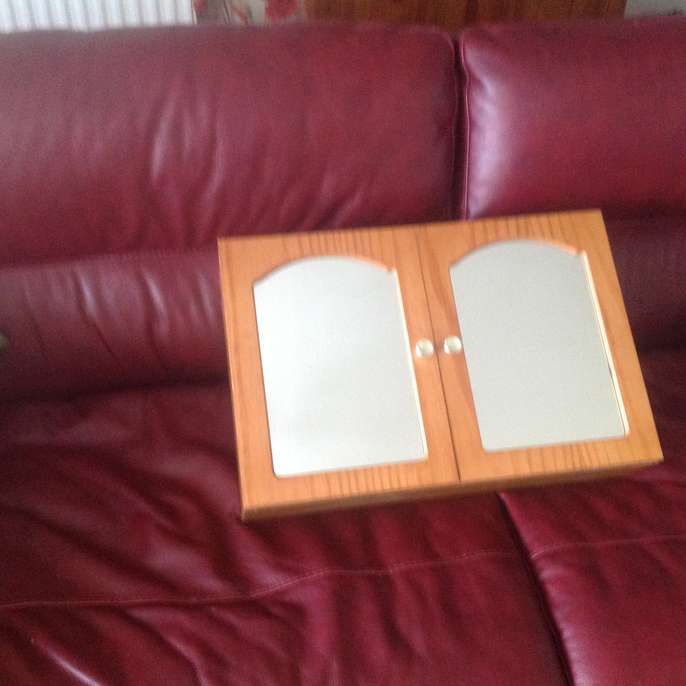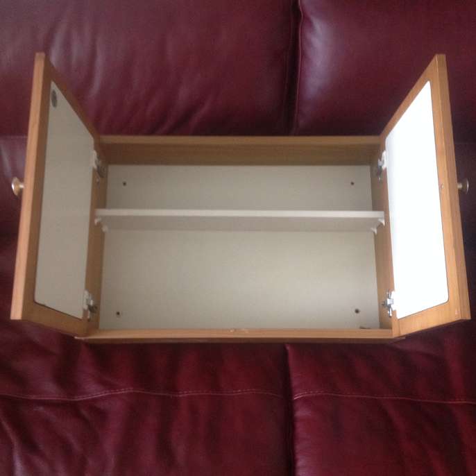Small Cabinet (with two mirrors on front and one internal shelf plus screws for fixing) In very good condition Size Approximately 22 inches x 15.5 inches x 5 inches deep Will sell for £8