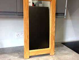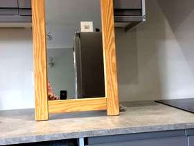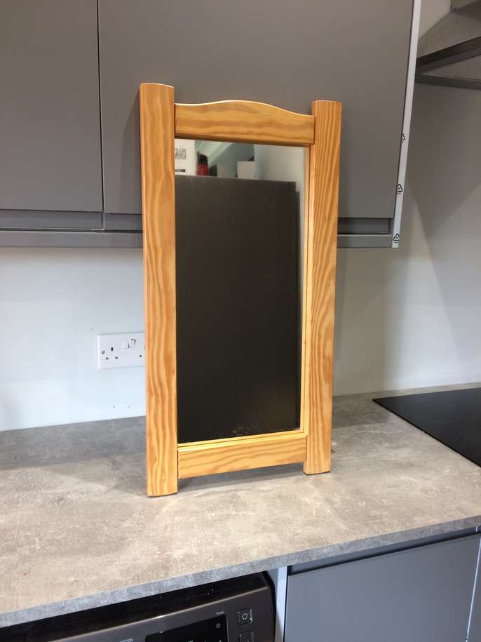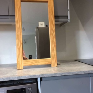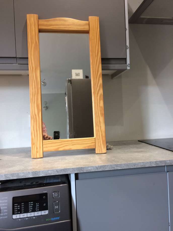 New small mirror (approx. 15x27 inches/ 38x69 cms) With pine style wood surround. Idea for small room, bedroom, bathroom hallway or small space. Brought but never used!