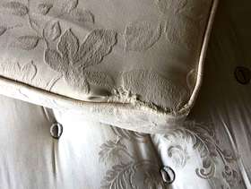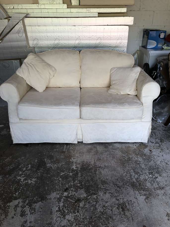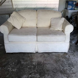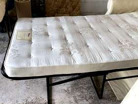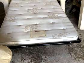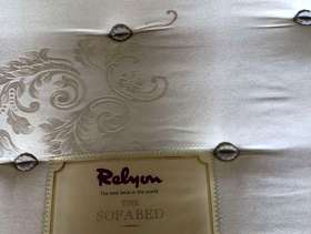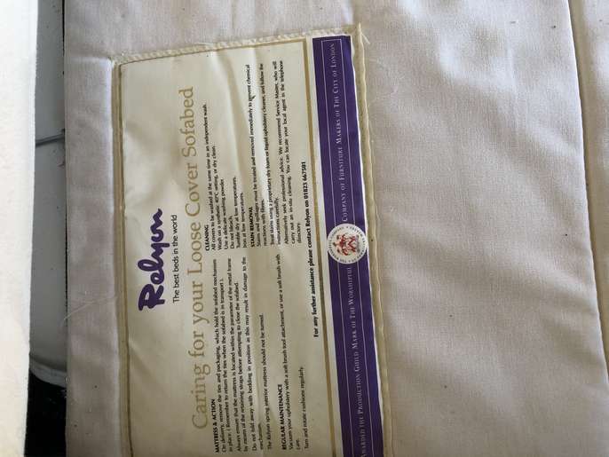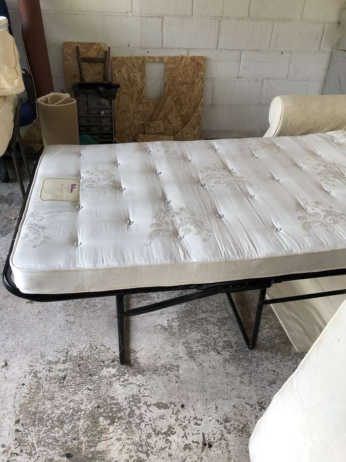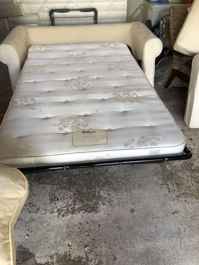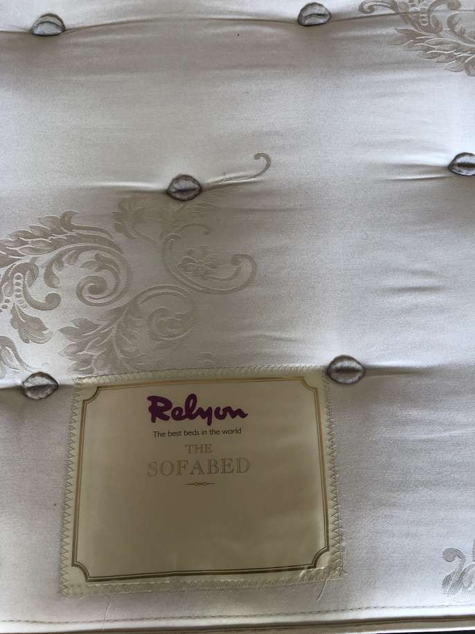 Good quality Relyon sofa bed. Photos taken in garage as we have moved. Previously kept as a spare guest bed and hardly used. Some damage to a corner of one cushion. Ideal to take to uni or as a spare guest bed or for a bedsit.