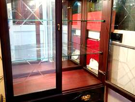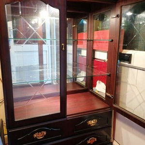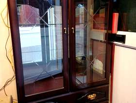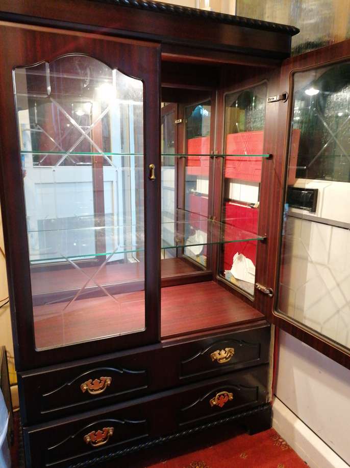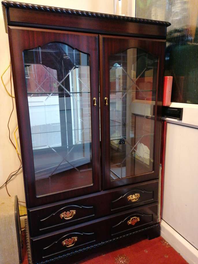 Solid dark wood display cabin ate with cut glass pattern doors and side panels and interior light. Two bottom draws, slight wear and tear on top of one for and one draw with metal gliders missing but still a good solid cabinate.