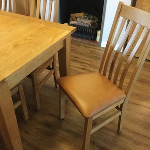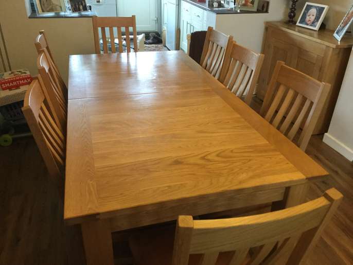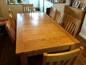 Solid oak table seating 8 and will extend to seat 12 - couple of slight marks and surface scratches 8 chairs with padded tan seats Furniture heavy Buyer collects