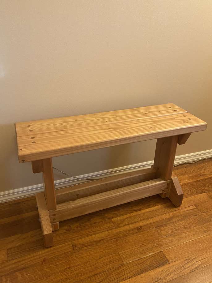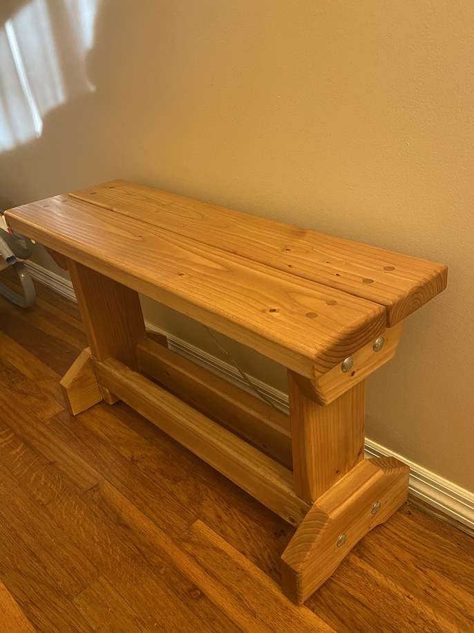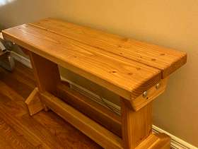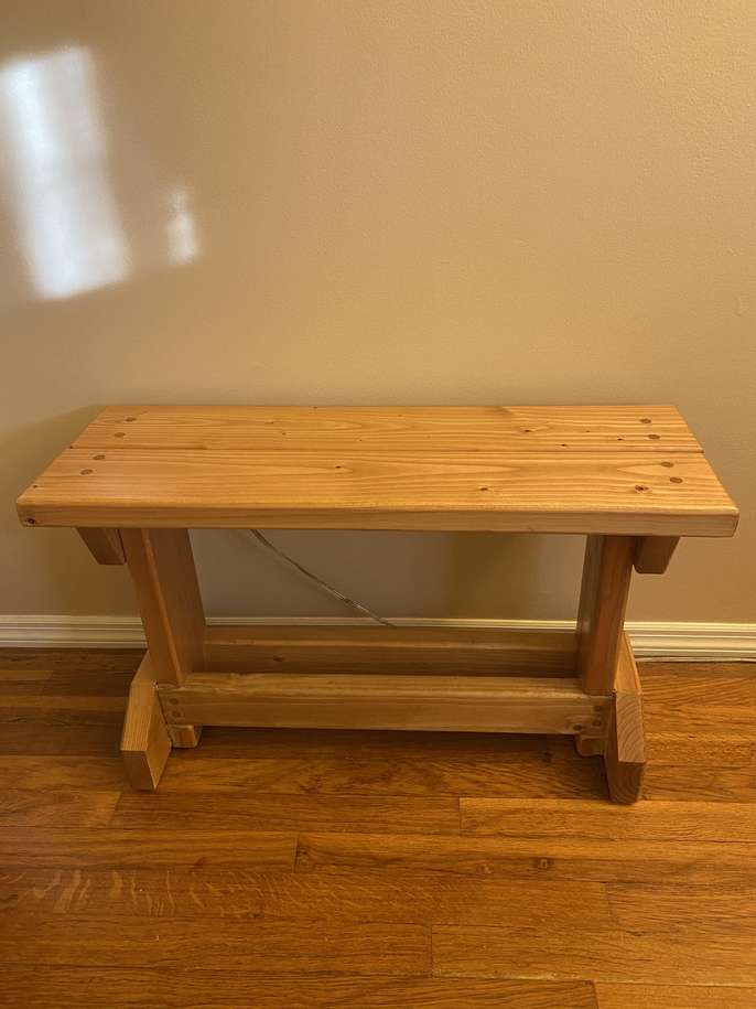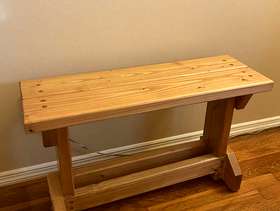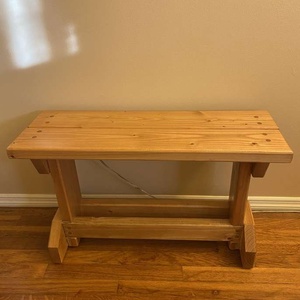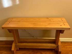 Hand Crafted Bench made of solid wood. It measures 30" long, 10" wide, and 18" high.
