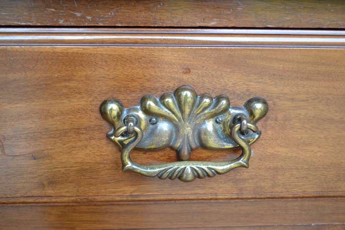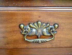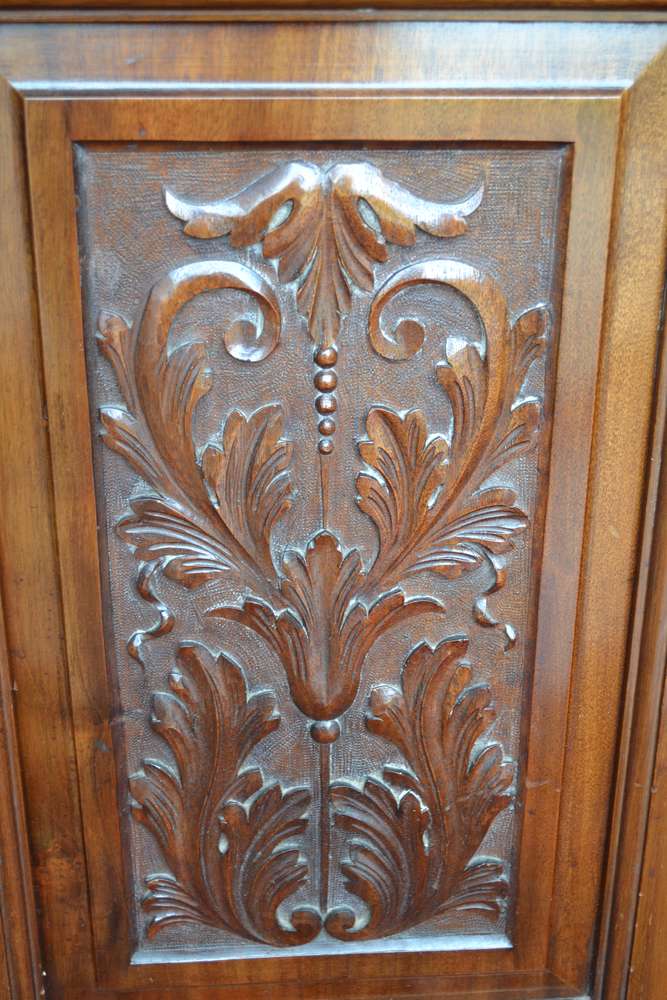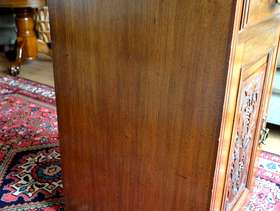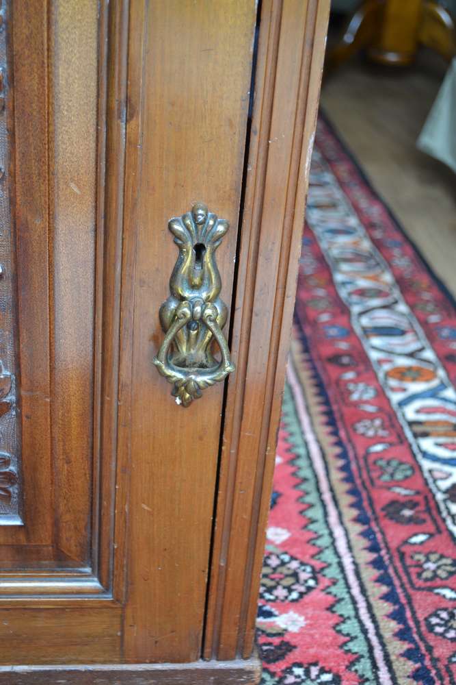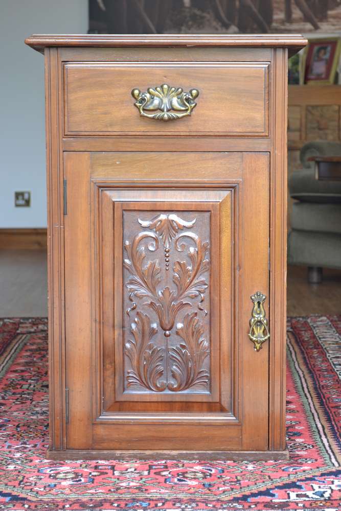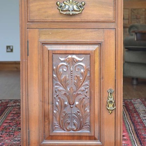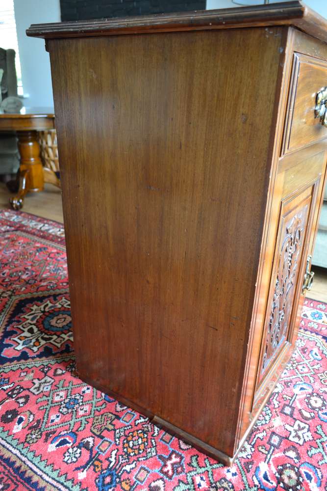 Solid wood cupboard/drawer cabinet, beautiful carving detail, 79 x 51 x 48 cms. Original handles, key for cupboard lock has been lost. Was originally attached to a larger piece, part of trim left side missing, crack in top right of item, both photographed. Bought in antique shop 35 years ago. Lovely interesting piece of furniture, I have never seen another like it. No room in my new home for it.