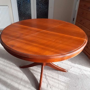 Solid wood extendable round dining table that will comfortably seat 6 people. Collection only.