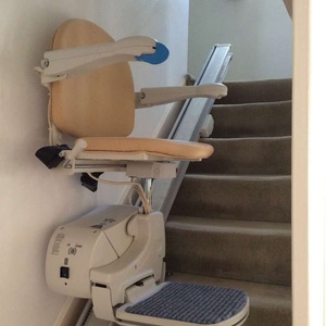 Installed in small cottage February 2018 at a cost of £2700 Commissioned and tested but never used. Still under 2 year warranty till February 2020. 2 remote controls and comprehensive paperwork. Max 120kg / 19 stones. Simply fixes to stairtreads with just 3 base plates and wood screws. Measured slope angle is 42 degrees but this will be adjustable. Rail is 10'3" long. Motorised slide adds about 12" to its effective length. Only projects 13" from wall when not in use with seat folded up.