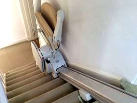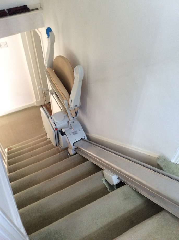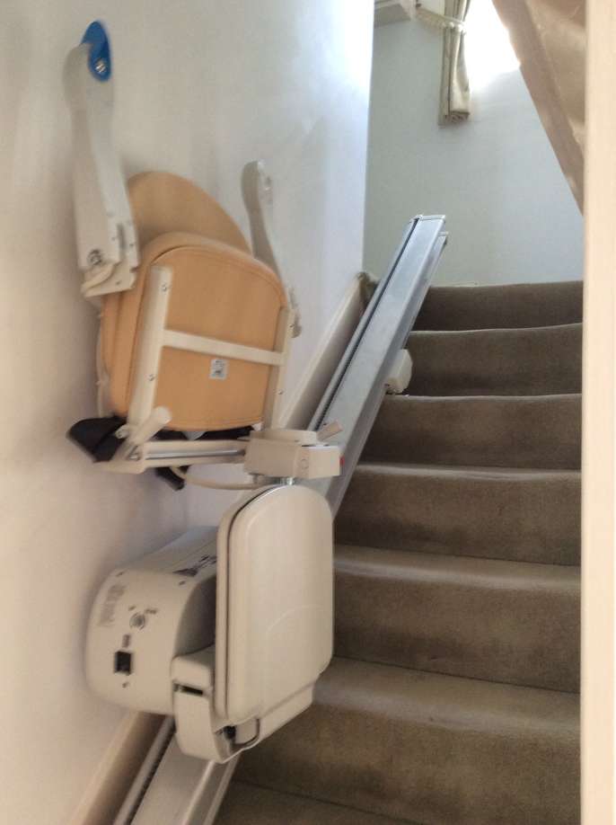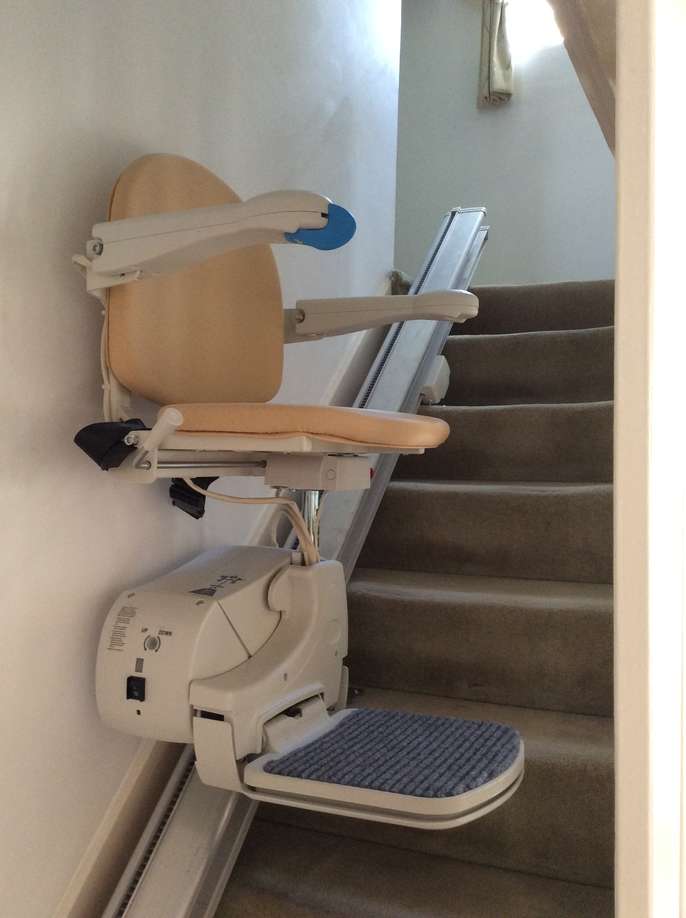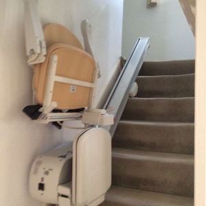 Installed in small cottage February 2018 at a cost of £2700 Commissioned and tested but never used. Still under 2 year warranty till February 2020. 2 remote controls and comprehensive paperwork. Max 120kg / 19 stones. Simply fixes to stairtreads with just 3 base plates and wood screws. Measured slope angle is 42 degrees but this will be adjustable. Rail is 10'3" long. Motorised slide adds about 12" to its effective length. Only projects 13" from wall when not in use with seat folded up.