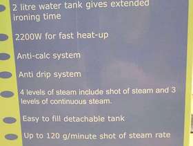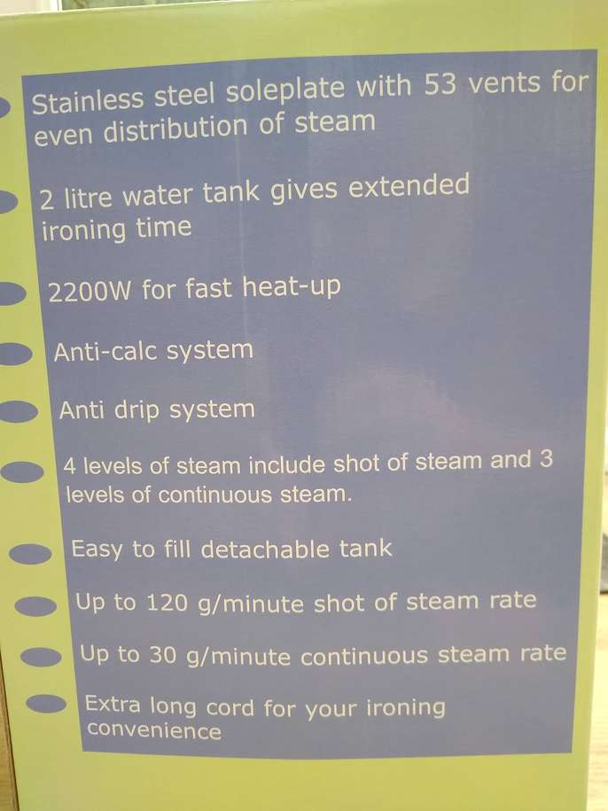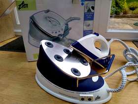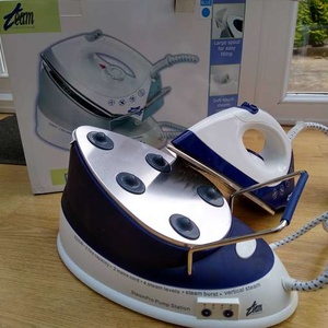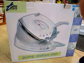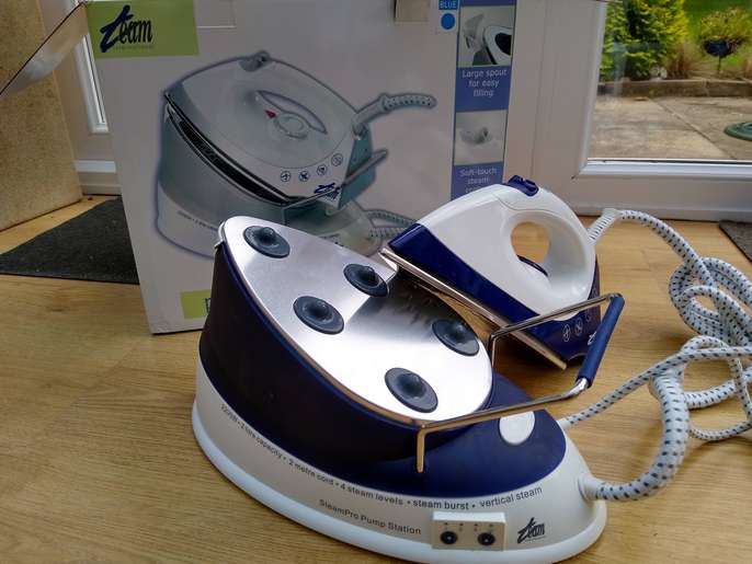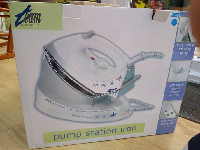 SteamPro Pump Station Iron (new, unused, original box), 2200W, up to 120g/min steam rate. Stainless Steel sole plate, 2 litre water tank, anti calcification system etc etc. see photos for more details