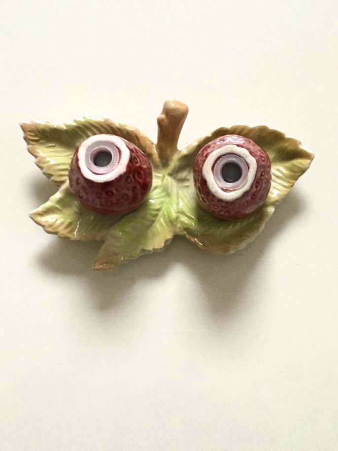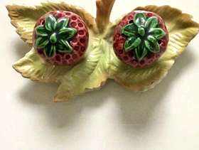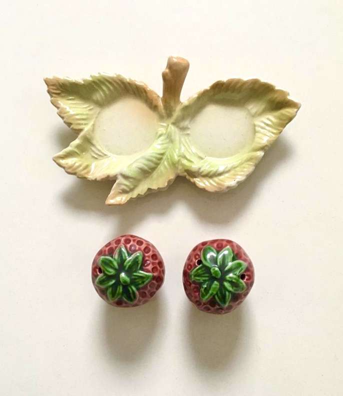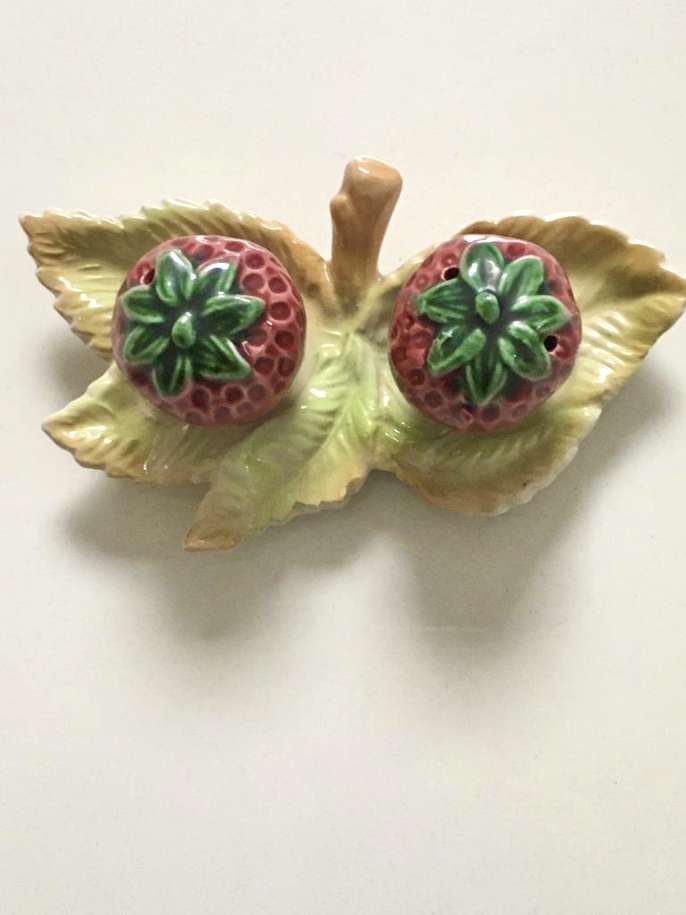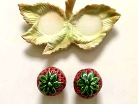 Strawberry Salt and Pepper pots in Leaf Tray, Never Used Beautiful to use for salt and pepper or as an ornament Length: 14cm x Height: 4cm Social distancing will be observed