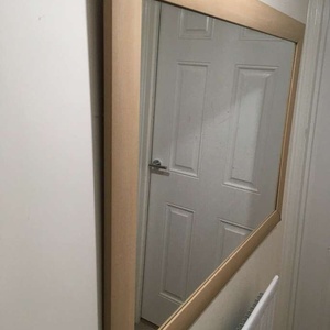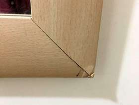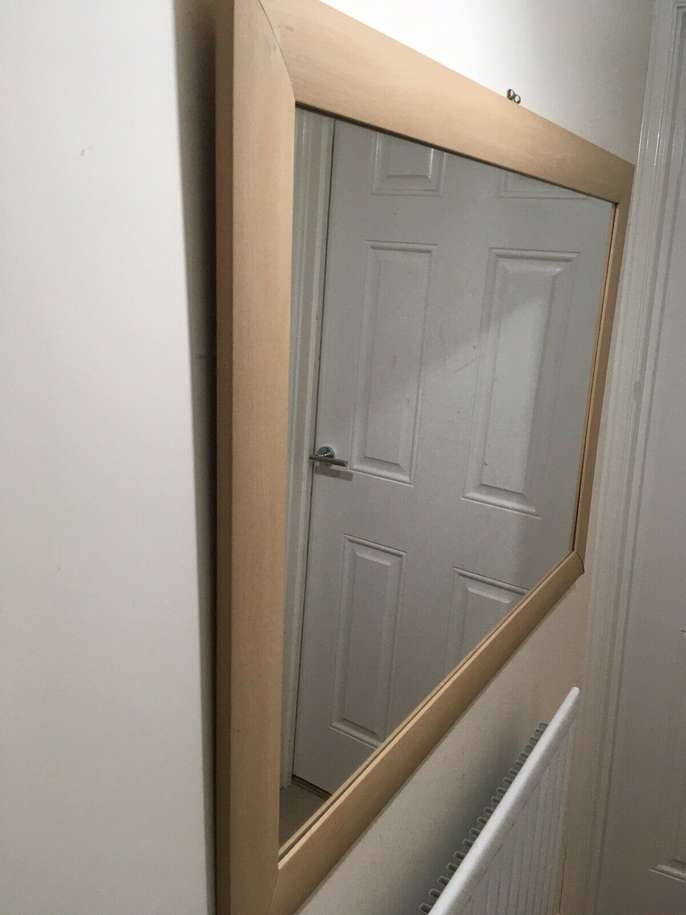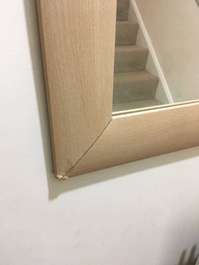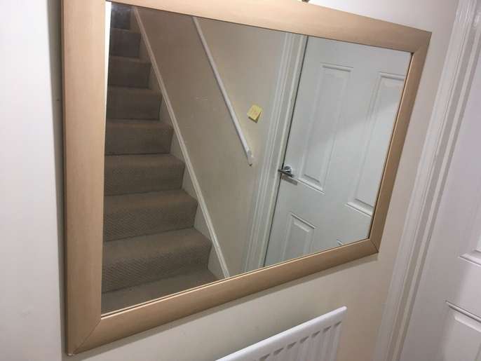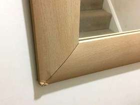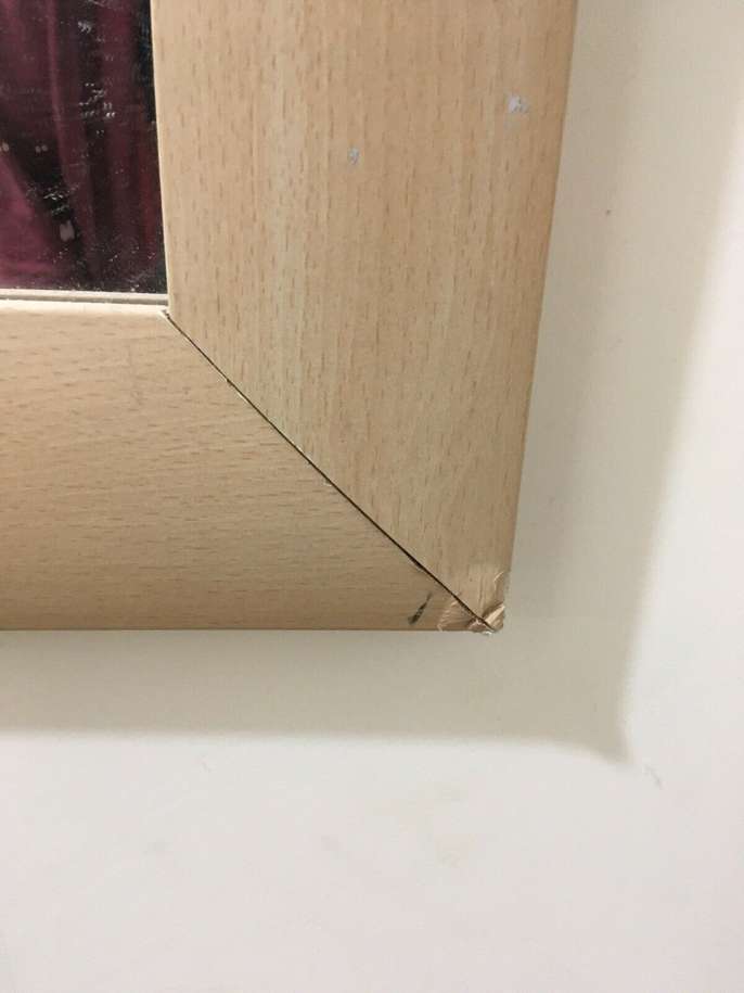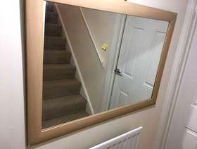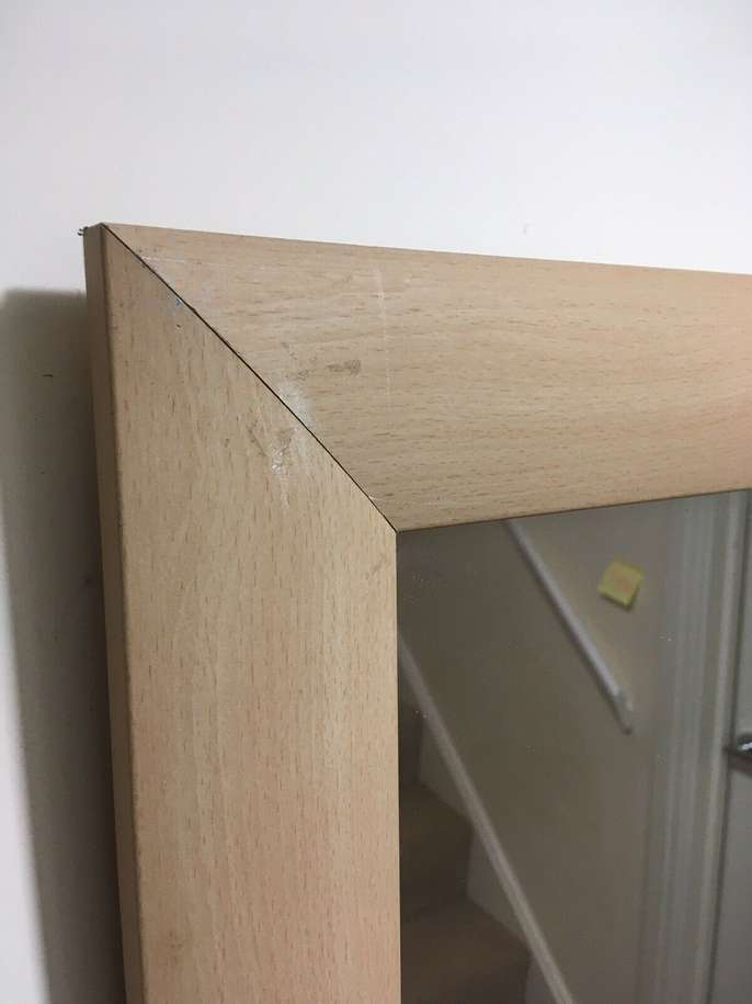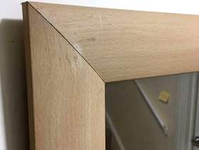 MODERN FRAMED RECTANGULAR MIRROR - LARGE. Condition is Used. Collection in person only. STYLISH MODERN CONTEMPORARY FRAMED RECTANGULAR MIRROR , LARGE. Good Condition 103 cm x 73 cm Frame border is about 7 cm wide modern bevelled style light wood effect. Laminate vinyl wood effect construction. Minor wear includes scratches on frame and two corners shown on photos are creased. Thickness is about 1.5 cm
